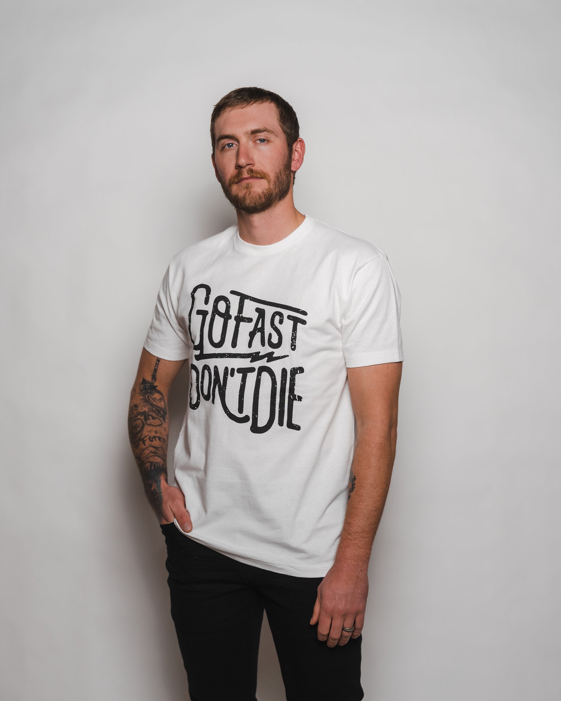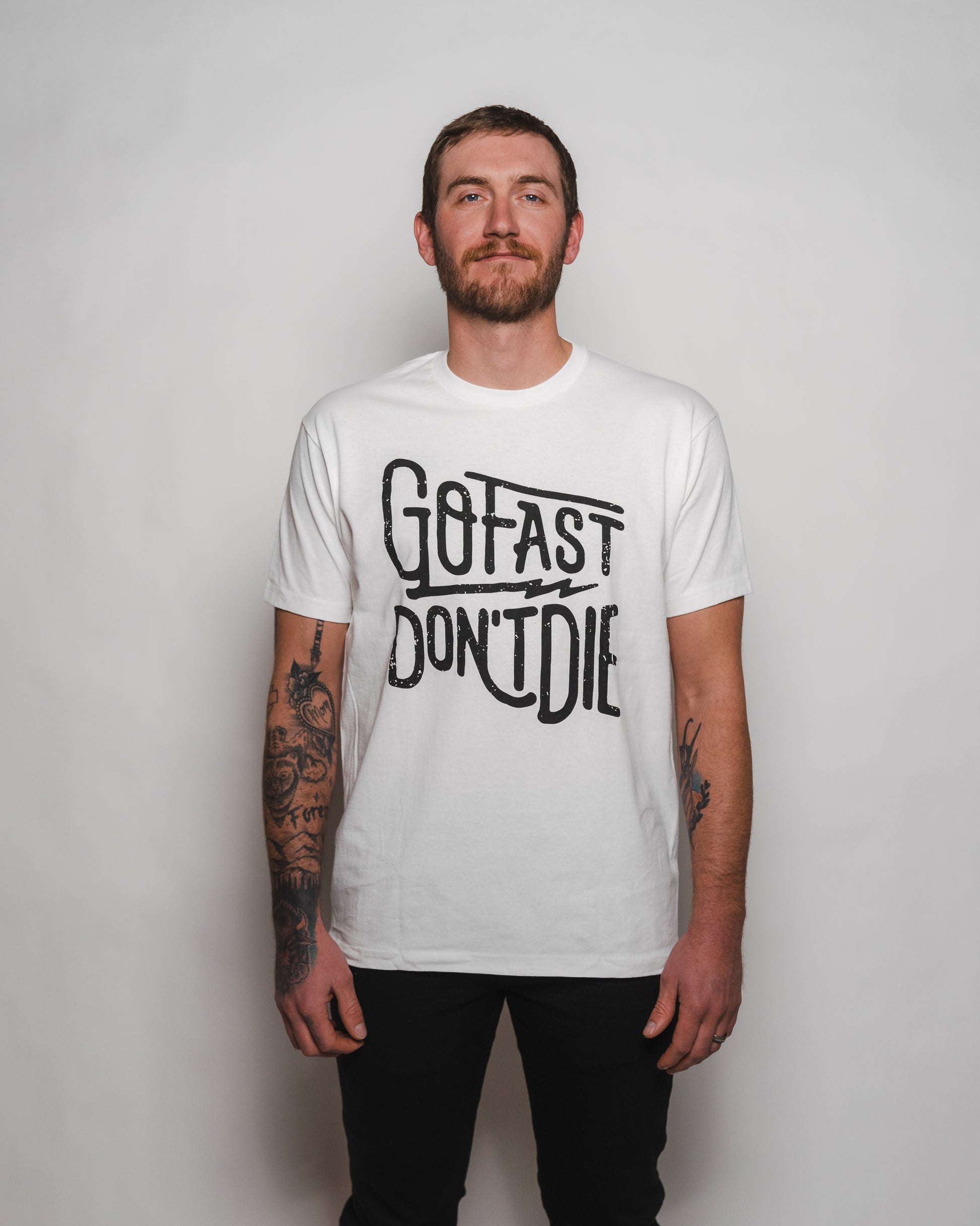 The Original Go Fast Don't Die T-Shirt. Painstakingly designed to let other know that you go fast, and whilst you are going fast, are firmly committed to living... not dying.