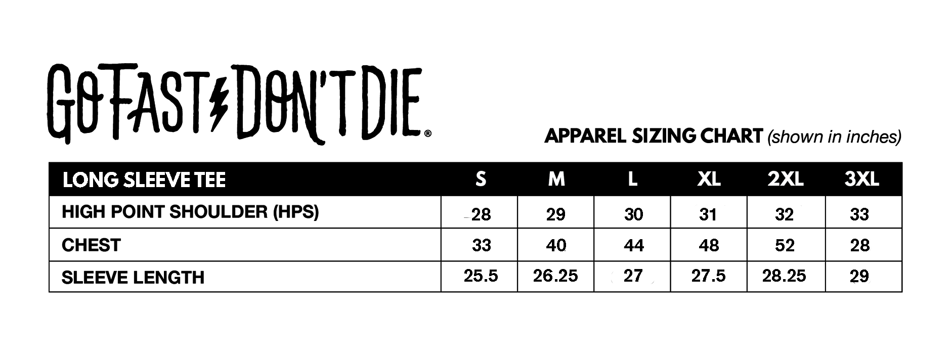 The Original Go Fast Don't Die Long Sleeve. Painstakingly designed to let others know that you go fast, and whilst you are going fast, are firmly committed to living... not dying.